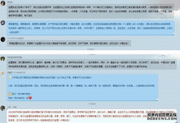 闫安:2020年开年我们就被新兴冠状病毒打破了所有的计划和安排,新年不能聚会,新学期不能正常开学,减少出行,佩戴口罩,这些无不让人深感疫情的无情。但中国有爱19个省份4.2万医务人员驰援武汉,努力为疫情防控奉献自己的全部力量。街巷,商场,路口,村庄的志愿者不计报酬辛勤工作,无数的感人事迹在这次疫情防控中令人动容。这就是中国人,这就是人间的大爱!我坚信在习总书记的带领下我们一定能够战胜这次疫情!中国加油!
