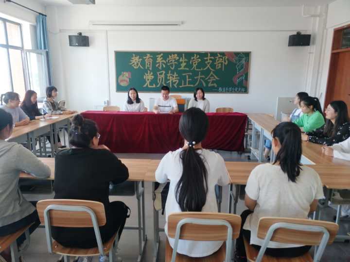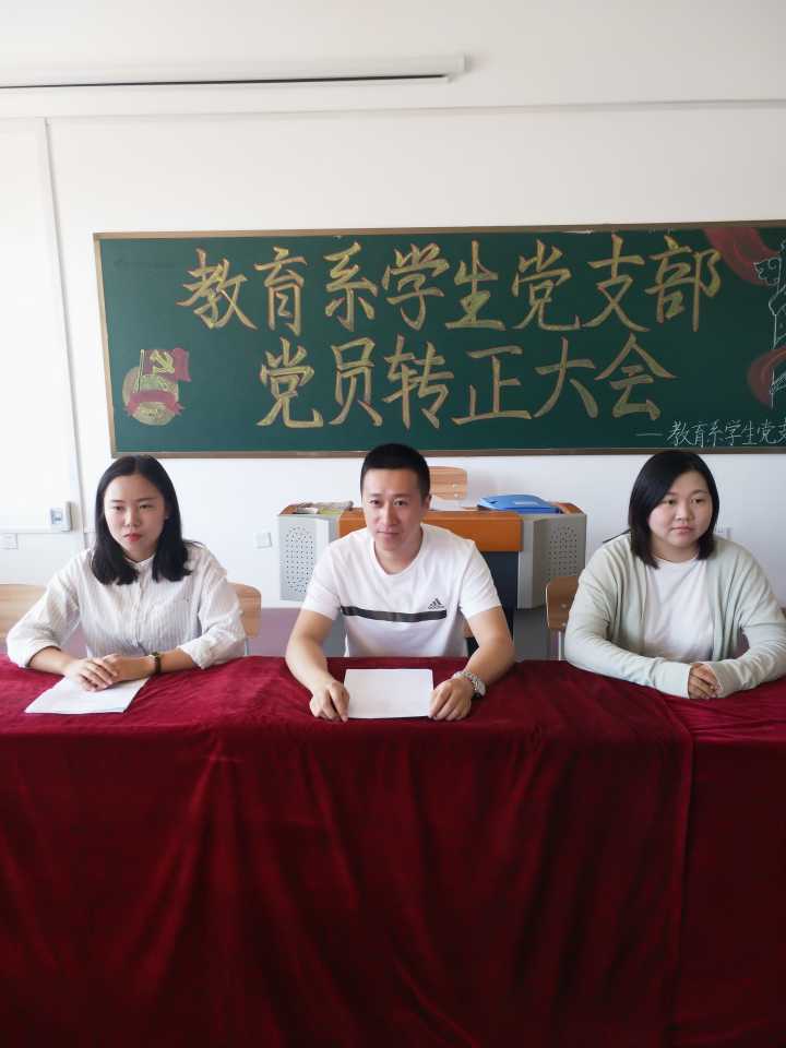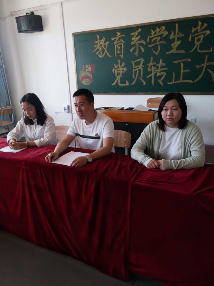 2019年6月17日上午,教育系学生党支部书记柳志明同志在综合楼1322教室主持召开 “教育系学生党支部党员转正大会”。参加此次大会的人员有:组织委员李扬同志、宣传委员崔馨月同志,教育系学生党员。